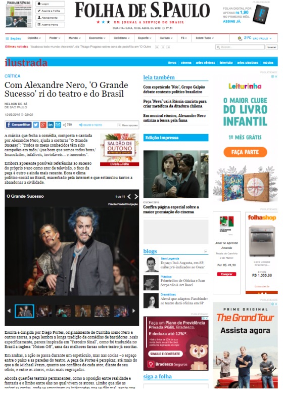 Crítica de Nelson de Sá, publicada na Folha de São Paulo em agosto de 2016. Confira a matéria completa: http://www1.folha.uol.com.br/ilustrada/2016/08/1804523-com-alexandre-nero-o-grande-sucesso-ri-do-teatro-e-do-brasil.shtml