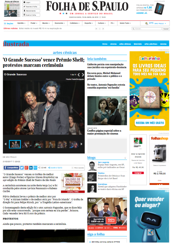Matéria publicada na Ilustrada em março de 2017. Confira a matéria completa em: http://www1.folha.uol.com.br/ilustrada/2017/03/1868599-o-grande-sucesso-vence-premio-shell-protestos-marcam-cerimonia.shtml